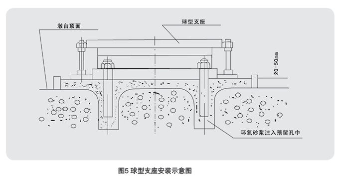 a安裝支座板及地腳螵栓:在下支座板四角用鋼楔塊調整支座水平,并使下支座板底面髙出橋嫌頂面20 50mm,找正支座縱、橫中線(xiàn)的位置,使之符合設計要求。用環(huán)氣樹(shù)脂砂漿灌注地腳嫌栓孔及支座底面墊層。 (圖5 )