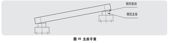 4.1普通板式橡膠支座的安裝 7.1.1現澆梁橡膠支座的安裝 A、先將支座墊石頂面清理干凈,若激臺墊石的標高差距過(guò)大,可用水泥砂漿調整。 B、在支座墊石上按設計圖標出支座位置中心線(xiàn),同時(shí)在橡膠支座上也標出十字交叉中心線(xiàn),將橡膠支座 的中心線(xiàn)與墊石中心線(xiàn)相吻合,支座即就位準確。 C、在澆注混凝土梁體前,在橡肢支座上設一塊比支座平面稍大的支承鋼板、鋼板焊錫固筋與梁體連接。 將支承鋼板視為現澆梁模板的一部分進(jìn)行澆注。為防止漏漿,可在支承鋼板與模板四周空隙處,用棉砂、油灰 或其它物質(zhì)填設。 8.1.2預制梁橡膠支座的安裝 A、首先將橡膠支座按設計要求直接放置在支座墊石上,墊石上面必須亊先清理干凈,并保證平整,然后 將上部構造直接安放在支座上。 B、架梁落梁安裝時(shí)應平穩,防止支座偏心受壓或產(chǎn)生初始剪切變形。 C、在T型梁安裝時(shí),若支座比梁肋底寬(應盡量避免),則應在支座與梁底之間用鋼筋混凝土墊塊或厚 鋼板作過(guò)渡,以免橡膠支座受力面積減少造成應力集中。 8.1.3普通板式橡膠支座的安裝亊項 A、支座安裝時(shí),必須保證位置準確,調整時(shí),避免產(chǎn)生過(guò)大的剪切變形,安裝時(shí)間最好在相當于全年平 均氣湛時(shí)進(jìn)行,以保證因低溫或高溫時(shí)造成支座偏離中心的位置不致過(guò)大,減少剪切變形。 如必須在高溫或低溫時(shí)安裝,可采取以下措施。 a待到全年平均氣溫時(shí),頂起主梁、將支座調整到中心位置。 b在安裝時(shí)根據當時(shí)氣湛計算使支座產(chǎn)生預變形。 c也可以在設計選用橡膠支座時(shí),適當增高支座髙度,使其比原設計支座的剪切變形量大。 B、要保證支座和墩臺及主梁緊密結合成一體,與橡膠支座接觸的上部構造底面和墩臺面必須清潔平整。 如不平整要用水泥砂漿找平。 C、使用普通板式橡膠支座一般沒(méi)用固定纗與活動(dòng)端之分,使用等髙支座時(shí),上部構造的水平位移由同一 片梁兩纗支座的剪切變形共同完成,各承擔一半。也可用厚度較小的橡膠支座作固定支座。 D、當梁體在縱向有坡度時(shí),可按以下幾種情況分別處理。 a梁體縱坡<=1%時(shí),縱坡由支座墊石調整支座斜置。如圖15 b梁體縱坡時(shí),在梁底與支座之間粘結一塊與梁縱坡一致的楔型墊塊,支座平置。如圖16 也可采用梁底一端削去與坡度相一致的一角,在另一端補上與削去部分相等的一角,使支座平置。如圖17 C為了方便施工可直接選用坡度板式橡膠支座。 E支座安裝時(shí),要考慮到以后更換調整橡膠支座的需要,通常采用在支座周邊空間設置各種凹樁以便安 放千斤頂。4.2聚四氟乙烯滑板式橡膠支座的安裝 7.2.1四氟板式橡膠支座的構造與聯(lián)接 a構造:四氟支座的整體結構有“封閉型”和“簡(jiǎn)易型”兩種。對城市橋梁及紫外線(xiàn)輯射、空氣污染與 粉塵嚴重地區,選用封閉型結構,其它場(chǎng)合可采用簡(jiǎn)易型。簡(jiǎn)易型和封閉型分別見(jiàn)圖18和圖19。 b聯(lián)接:四氟板式橡膠支座下鋼板的聯(lián)接可在激臺支承墊石上頂留相應凹坑。架梁時(shí)下鋼板用環(huán)氧樹(shù)脂砂 漿粘結于坑內,四氟板式橡膠支座的上鋼板澆梁施工時(shí),可采用鋼板焊描固筋一同澆注。預制梁施工時(shí),上鋼 板用環(huán)氣樹(shù)脂砂漿與梁底粘結。 環(huán)氧樹(shù)臘砂漿配合比(重量比) 環(huán)氧樹(shù)臘(6101 ) : 100,乙二胺:8—10或三乙烯四胺:8—12 苯二甲酸二丁脂:12 水泥或石英粉或細砂:250-300 8.2.2四氟板式支座安裝應注意亊項 四氟板式支座的安裝方法與普通板式支座基本相同,但應注意下列亊項。 a四氟板式支座系作活動(dòng)支座用,應同普通板式支座(作固定支座)配套使用。安裝時(shí)應精心細致。 支座應按設計支承中心準確就位。梁底鋼板與支承墊石(或下鋼板)頂面盡可能保持平行,同支座上下 面全部密貼;同一片梁的各個(gè)支座位置應在同一平面上;避免支座的偏受壓、不均勻支承與個(gè)別脫空現象。 b與四氟板接觸的不銹鋼板表面不允許有損傷、拉毛現象;以免增大摩擦系數及損壞四氟板。 c支座四氟面的儲油凹坑內,安裝時(shí)應涂刷不易揮發(fā)的“5201桂脂”作潤滑劑以降低摩擦系數。 d支座與不銹鋼板的位置視安裝時(shí)溫度而定,若不銹鋼板有足夠長(cháng)度,則任何季節都可使支座居不銹鋼板 中心位置。 e落梁時(shí),為防止梁與支座發(fā)生縱橫向滑移,宜用木制三角勢塊在梁體兩側加以定位,待落梁工作全部完 畢后拆除。 f上部結構為連續體系時(shí),固定端橡膠支座為提高可靠度,防止固定支座的縱橫滑移,可設置防爬裝置。