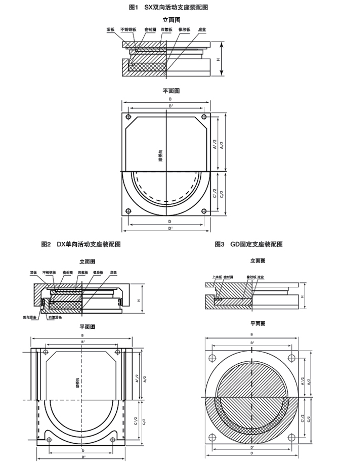 雙向(多向)活動(dòng)支座和單向活動(dòng)支座由上座板(包括頂板和不銹鋼滑板)、聚四氟乙烯滑板、中間鋼 板、密封圈、橡膠板、底盆、地細燦栓和防塵罩等組成,單項活動(dòng)支座沿活動(dòng)方向還設有導向擋塊。
